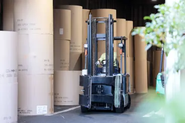 段ボール原紙はクランプリフトで運びます